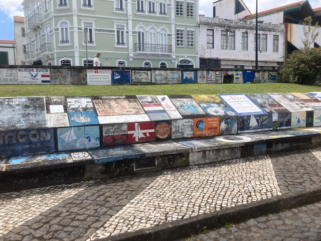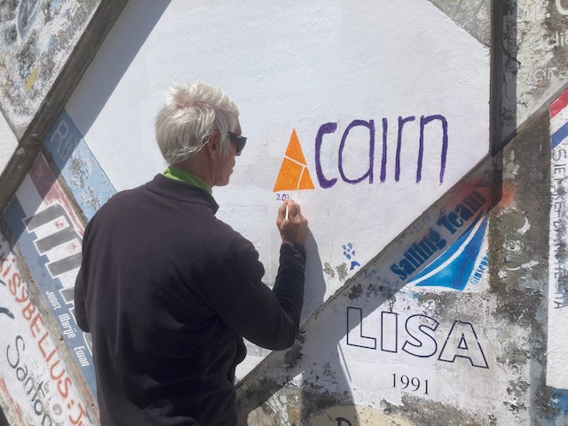 La ville est très agréable et paisible. Tradition oblige, il paraît aussi que ne pas le faire porte malheur, nous marquons notre passage, malgré le manque de place, en peignant maladroitement et avec peu de moyens, un comble pour des graphistes, le logo de Cairn. Certains équipages ont réalisé ici de véritables œuvres d’art et c’est un plaisir de déambuler sur les quais et de découvrir parfois la trace d’un bateau connu. Lieu incontournable, le café Peter’s bar, nous accueille pour un premier vrai repas depuis longtemps.