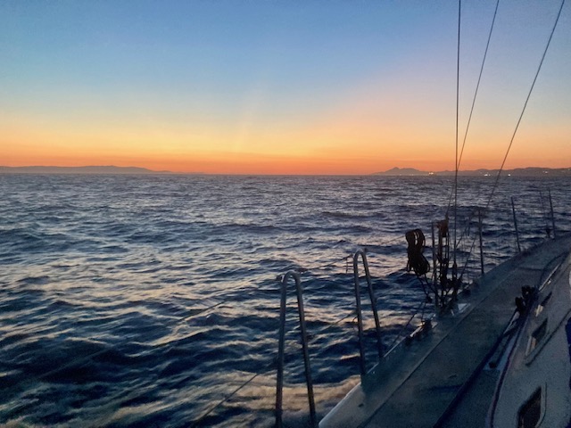 Le 25 juin, nous quittons les Açores avec un vent de face, au moteur, en espérant que passé le dernier cap nous pourrons faire de la voile. Nos vœux sont exaucés, une allure de travers-bon plein, plutôt près serré en arrivant sur Tanger, nous permettra en huit jours de rallier l’Afrique sans rencontre désagréable avec nos amies les orques. La boucle est bouclée. Mais reste encore a passer Gibraltar en évitant toujours ces charmants mammifères joueurs.